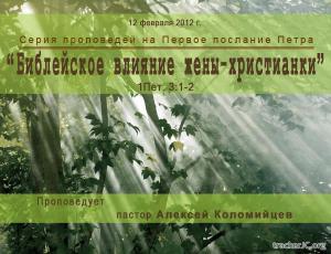 Жизнь Иисуса Христа, наполняющая собой каждого истинного христианина, обязательно находит практическое выражение в каждой конкретной сфере нашего бытия. Это касается и семьи. Говоря о христианском влиянии на незнающий Бога окружающий мир, апостол Петр особо останавливается на действии этого влияния внутри семьи. Начиная с описания положения жены, он ясно подчеркивает, что христианское влияние здесь действует по тем же принципам, как и в любом другом месте. В чем практически выражаются эти принципы, об этом и пойдет речь в данной проповеди.