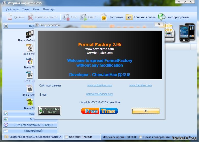 Название: FormatFactory 2.95 Год выхода: 2012 Платформа: Windows® XP/Vista/Seven Язык интерфейса: Multilanguage (Русский) Тип распространения: Free (бесплатно) Описание: FormatFactory - многофункциональный конвертер различных файлов мультимедиа. Имеет рад дополнительных функций, превращающих FormatFactory в универсальный инструмент для работы с мультимедийными файлами разных форматов. Поддерживается конвертация популярных видеоформатов в MP4, 3GP, MPG, AVI, WMV, FLV, SWF, а также конвертация аудиоформатов в MP3, WMA, MMF, AMR, OGG, M4A, WAV. В FormatFactory есть функция преобразования изображений в форматы JPG, BMP, PNG, TIF, ICO, GIF, PCX, TGA. Среди дополнительных возможностей FormatFactory есть такие, как увеличение и вращение изображений, присвоение им тегов, а также восстановление поврежденных аудио и видеофайлов. Системные требования: Все 32бит Windows OS Доп. информация: Основные функции: