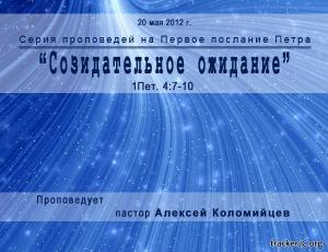 Информация о видео-материале Проповедник: Алексей Коломийцев Тема: Созидающее ожидание Год выхода: 2012 Жанр: Видеопроповедь, богослужение