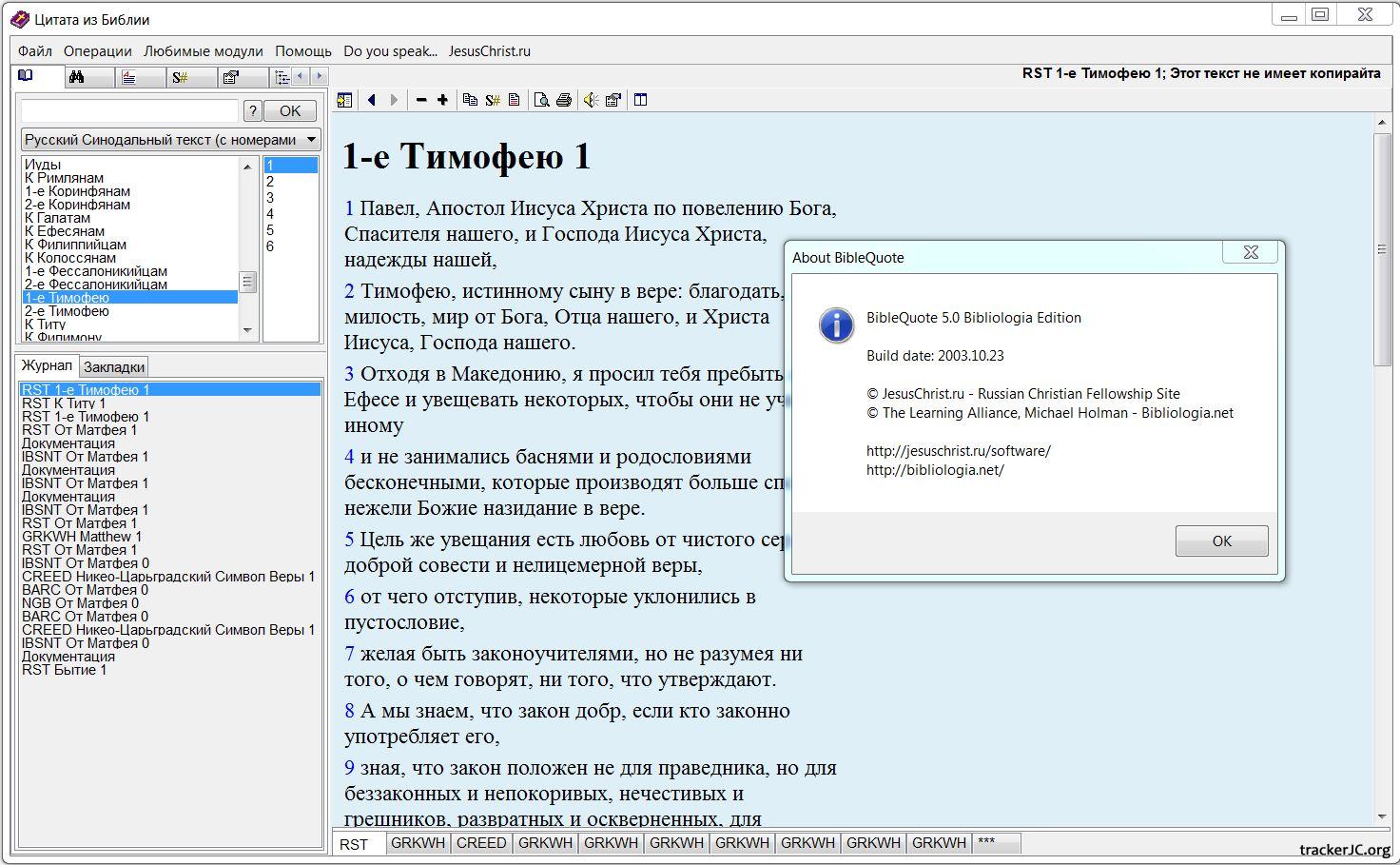 Название: Цитата из Библии 5.01 (Электронная Библия) / BibleQuote 5.01 Год выхода: 2003 Платформа: Windows Язык интерфейса: Русский, Украинский, Английский, Немецкий Тип распространения: Бесплатно Описание: «Цитата из Библии» родилась как простая программа для цитирования текстов Библии и