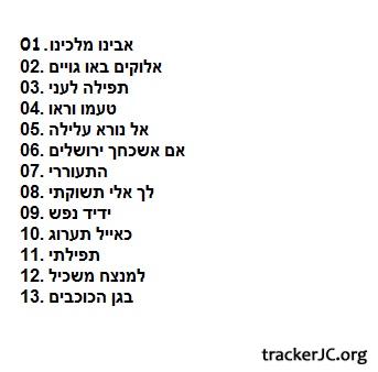 Исполнитель: Ben Snof Альбом: Hine Hu Ba Год выхода: 2008 Жанр: сефардская религиозная музыка Треклист: 01. Avinu Malkenu (3:10) 02. Elokim Bau Goim (3:41) 03. Tefila LeAni (3:29) 04. Taamu UReu (3:22) 05. Al Nora Alila (3:31) 06. Im Eshkaheh Yerushalaim (3:28) 07. Hitoreri (4:02) 08. Leha Eli Teshukati (4:17) 09. Yedid Nefesh (4:33) 10. Keayal Taarog (4:50) 11. Tfilati (3:22) 12. Lemnatzeah Maskil (5:35) 13. BeGan HaKohavim (5:59) Звук: MP3,128 кБит/с Продолжительность: 00:53:19 Размер: 49.02 MB (51,403,454 байт)