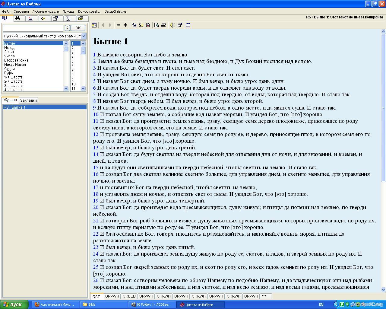 Название: Цитата из Библии Год выпуска: 2006 Платформа: Windows 2000/XP/Vista Язык интерфейса: руский Описание: Цитата из Библии Синодальный перевод и Женевский никаких книг и дополнений . Очень удобная тем у кого память в машине ограничена. Системные требования: Работает даже на слабых машинах.